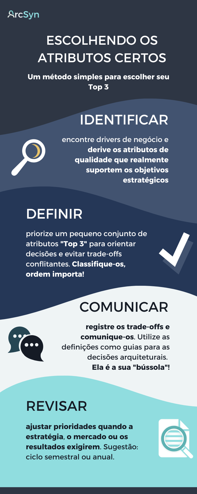 Se a sua empresa é uma start/scale-up, concentre‑se nos dois ou três atributos que melhor suportam a visão e as metas estratégicas da empresa — isso facilita a tomada de decisões e evita conflitos de design. Neal Ford e Mark Richards defendem de 5 a 7 atributos, acho que isso se aplica a grandes corporações ou grandes projetos, se esse for o seu caso, considere-os.